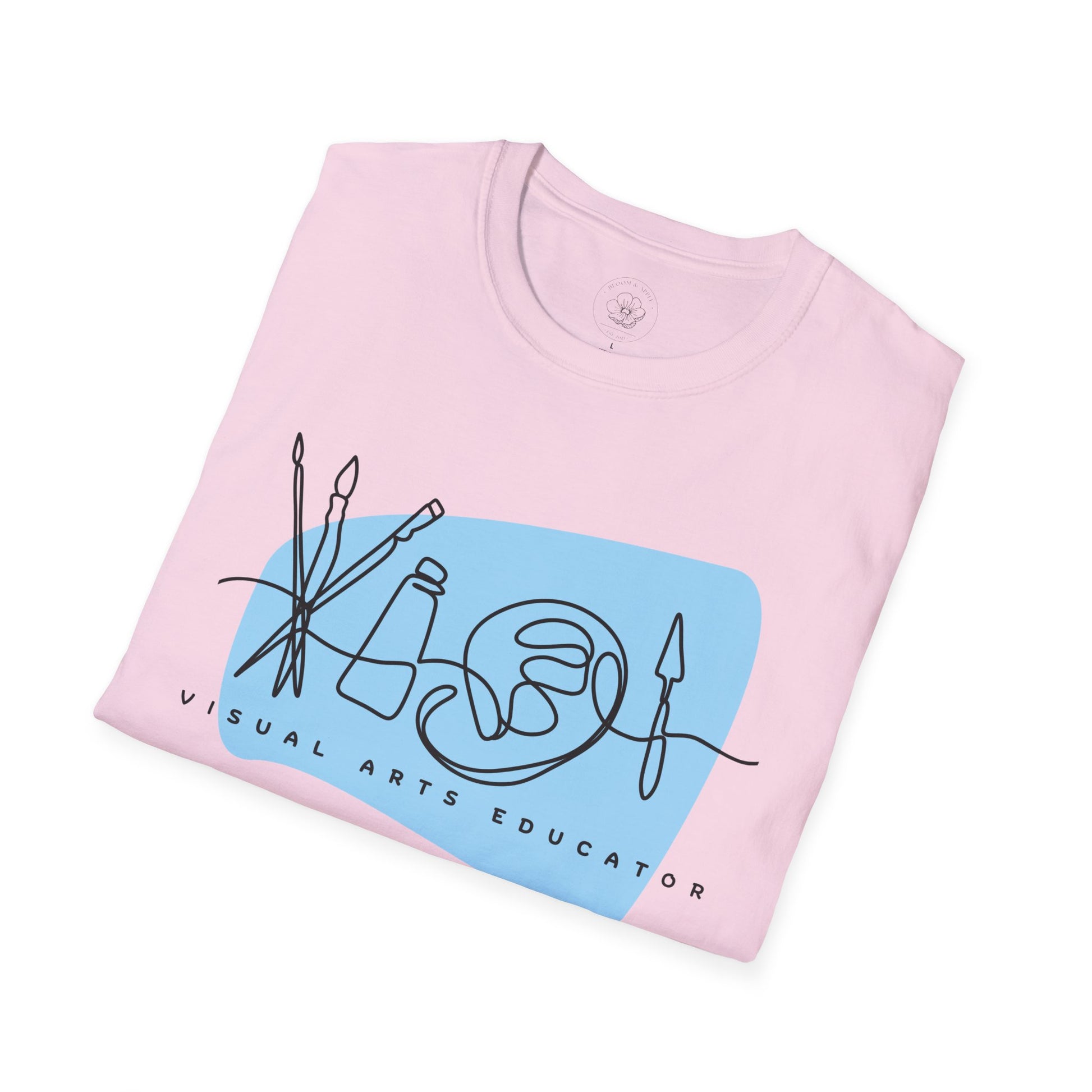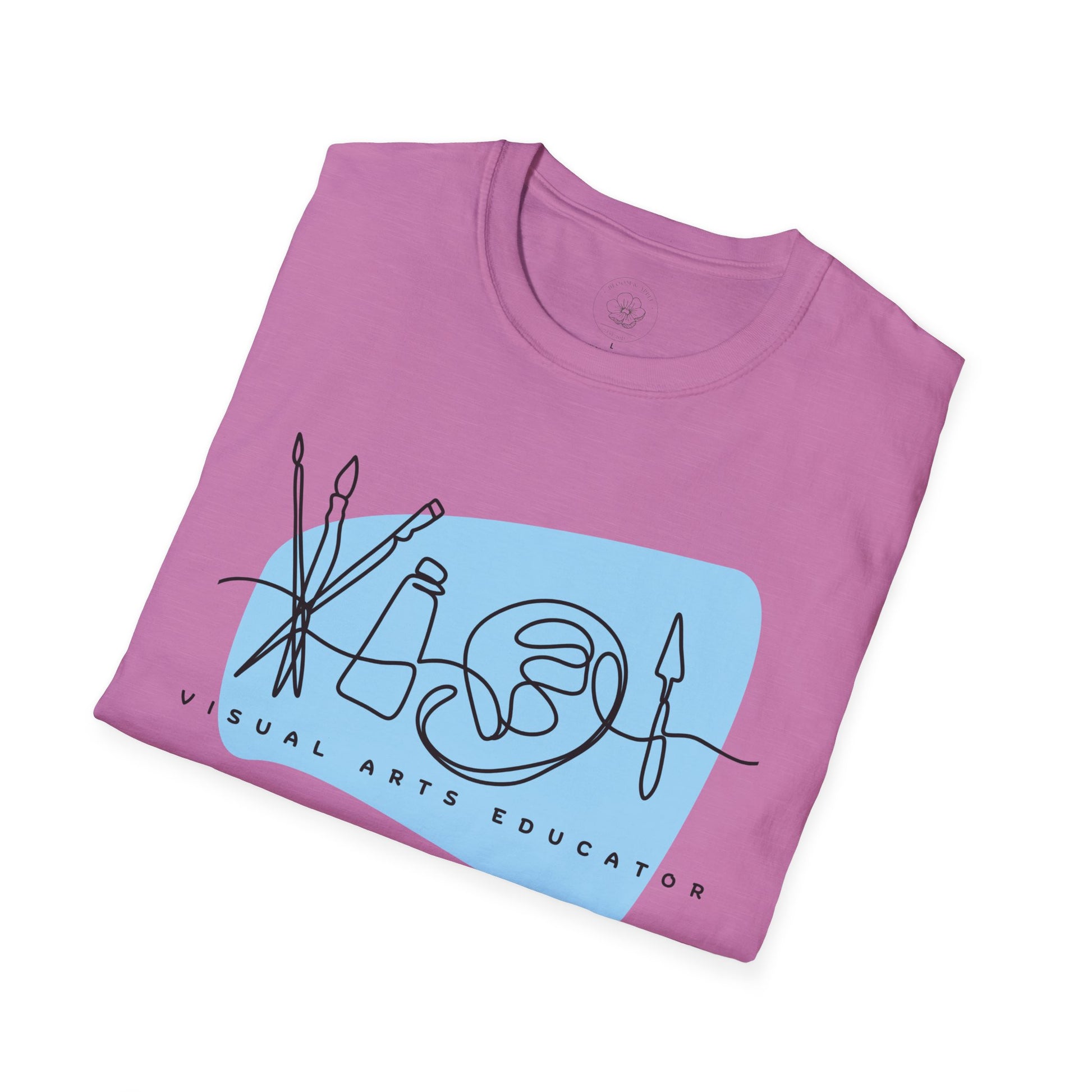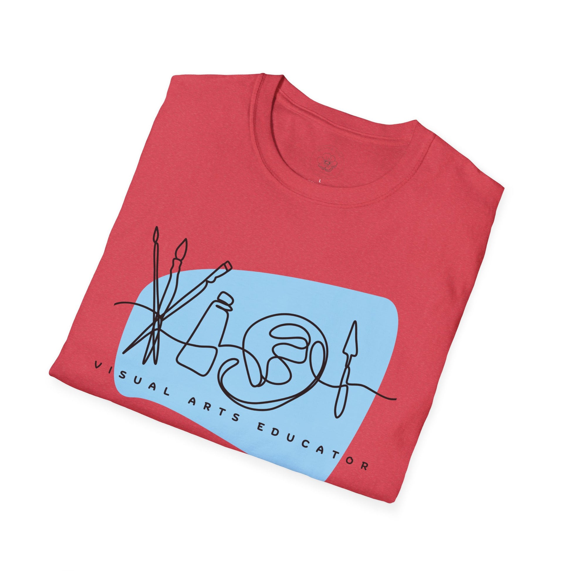 A graphic t-shirt designed for fine arts teachers, perfect for expressing creativity and individuality. This softstyle unisex t-shirt is made from durable and smooth fabric, ideal for printing. The classic fit and crew neckline make it a versatile piece for any occasion, whether formal or semi-formal. Suitable for adults and made with ethically grown US cotton.